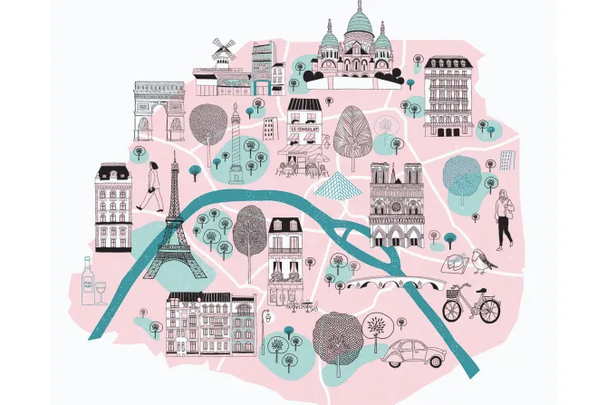 Ilustrowana mapa Paryża z legendarnymi symbolami.