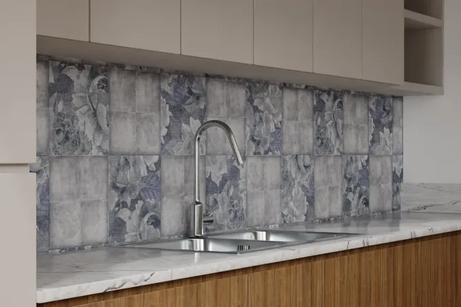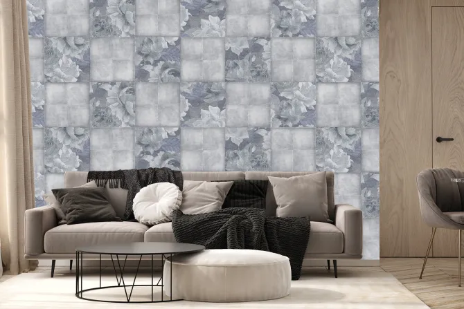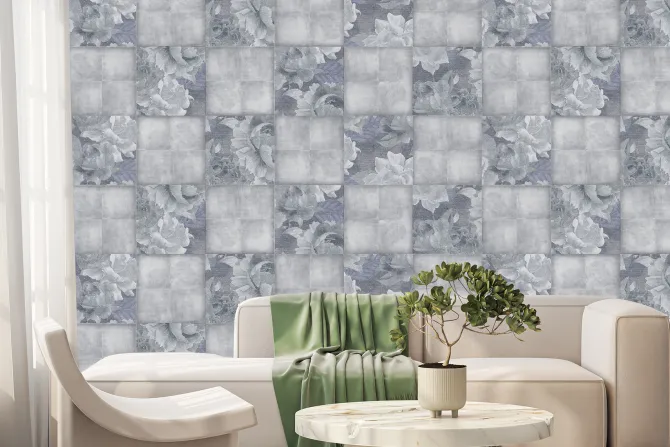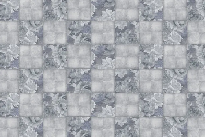 Imitacja kwadratowych płytek z liśćmi.