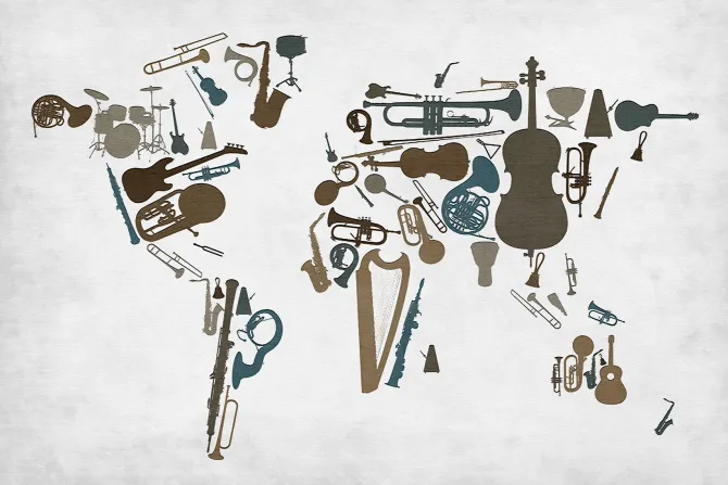 instrumenty, saksofon, perkusja, gitara, mapa świata, mapy