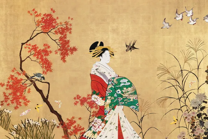 Fototapeta: Japoński ogród z kobietą i ptakami