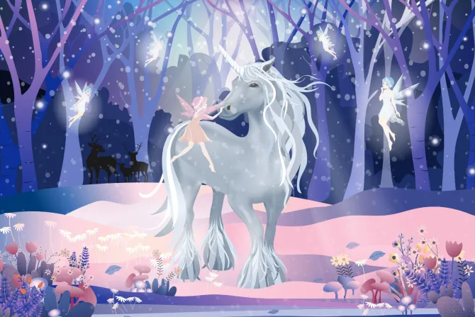 Jednorożec i wróżki w bajkowej krainie.