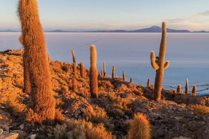 Kaktusy na pustyni na tle gór.
