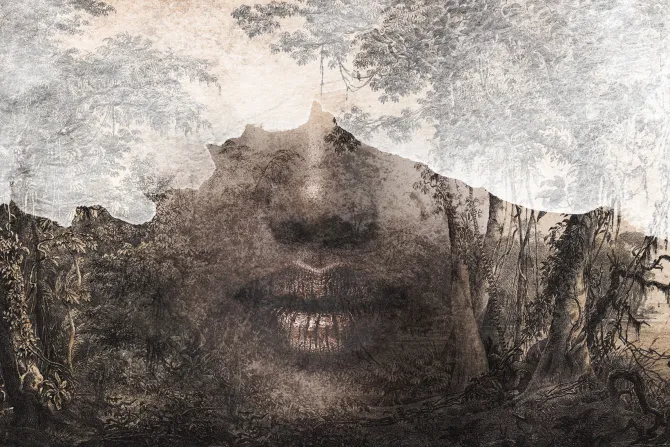 Kobiecy portret abstrakcyjny ze złotawym akcentem na ustach wśród tropikalnych roślin.