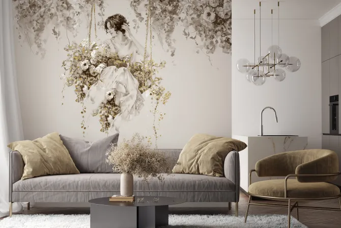 Fototapeta: Kobieta na huśtawce wśród kwiatów