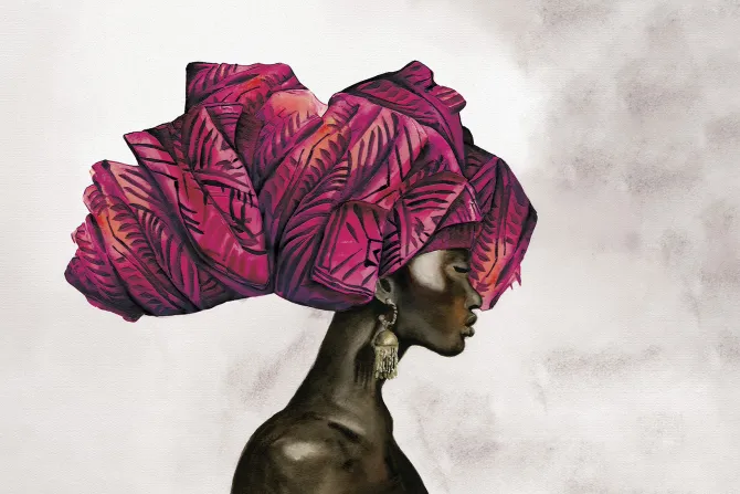 Kobieta w afrykańskim turbanie na głowie.