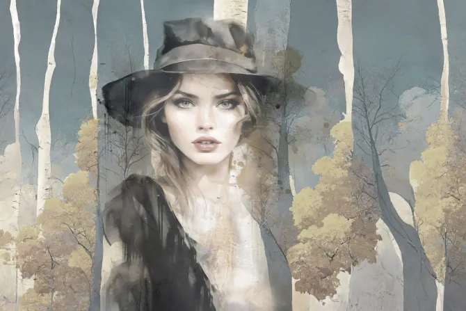 Kobieta w kapeluszu wśród abstrakcyjnego leśnego pejzażu.