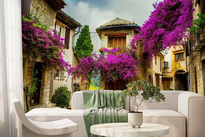 Fototapeta: Kolorowa aleja z bugenwillą w zabytkowym miasteczku