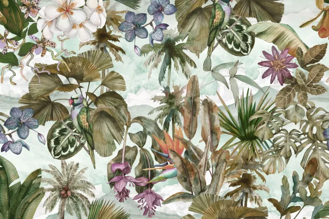 dżungla, zieleń, storczyk, kwiaty, monstera, palma, natura, liście, papuga