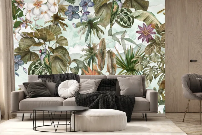 Fototapeta: Kolorowa papuga wśród liści i kwiatów