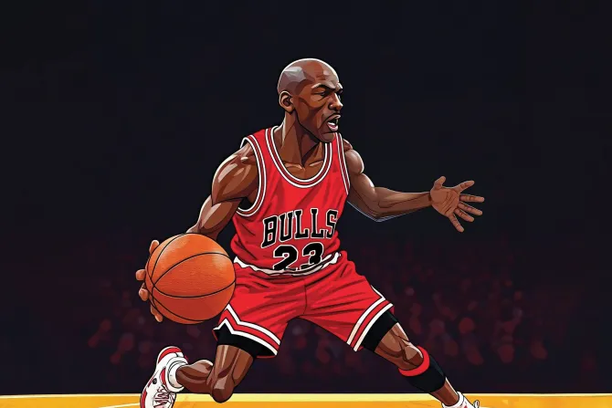 Koszykarz biegnący z piłką na boisku.