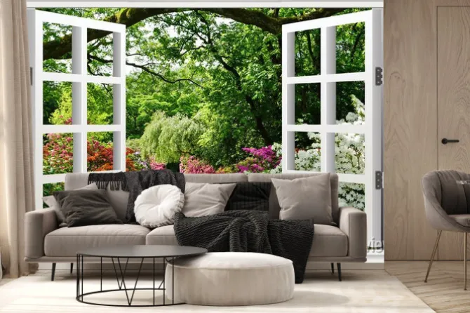 Krajobraz 3D okna z panoramą lasu.