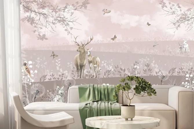 Fototapeta: Krajobraz dzikiej polany z jeleniem i leśnymi zwierzętami