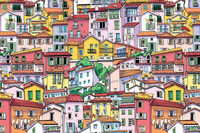 Krajobraz z kolorowymi kamienicami.