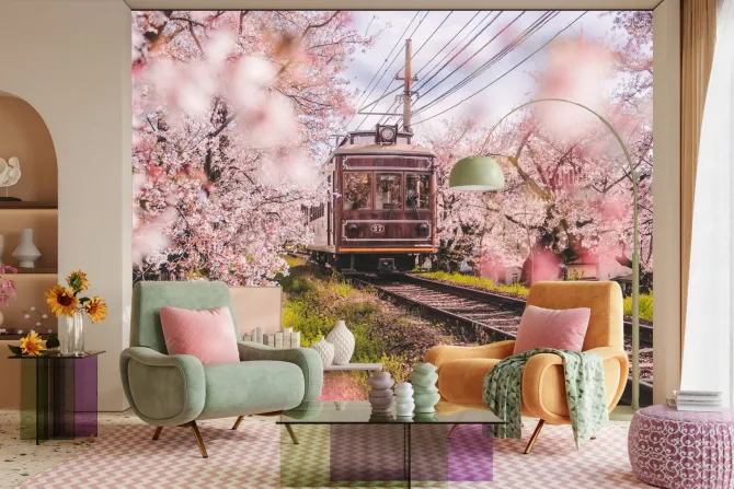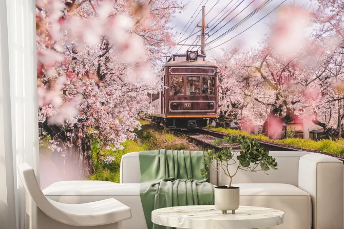 Fototapeta: Krajobraz z pociągiem i kwitnącą wiśnią w kioto