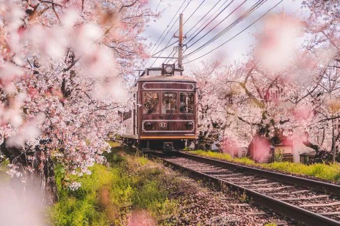 Krajobraz z pociągiem i kwitnącą wiśnią w Kioto.