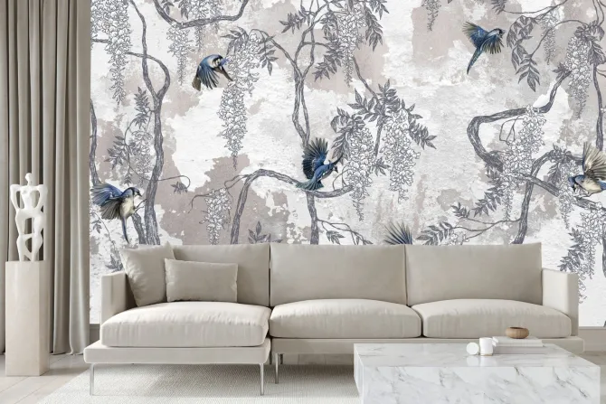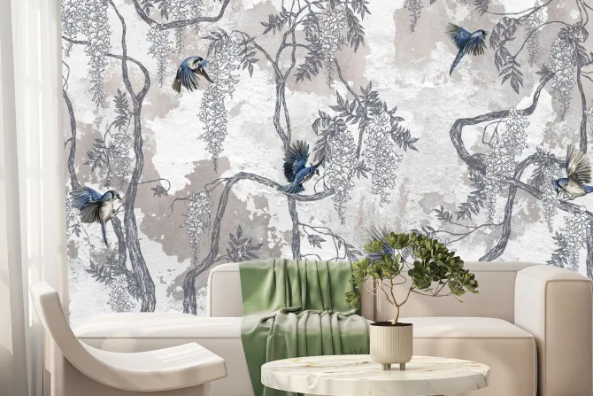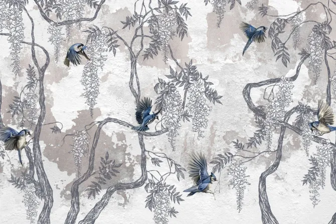 Fototapeta: Kwiatowe drzewa z ptakami na betonie
