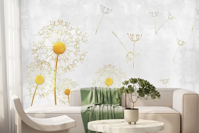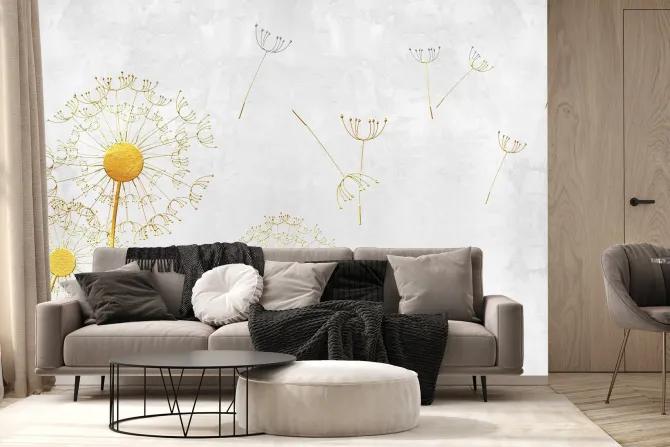 Kwiaty dmuchawce na betonowym teksturowym tle abstrakcyjny minimalistyczny wzór.