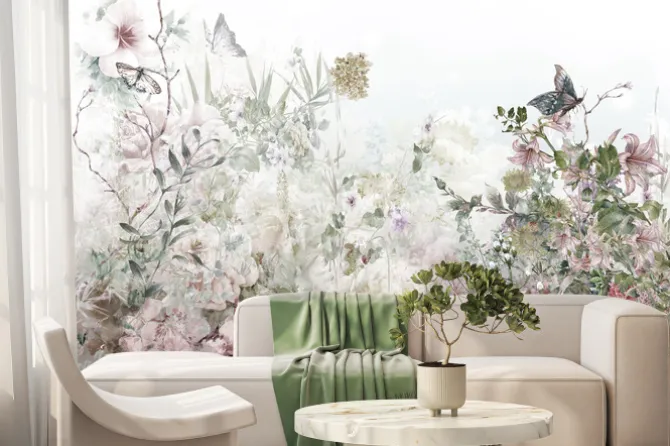 Fototapeta: Kwiaty gałązki i motyle na polanie w stonowanych kolorach