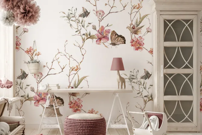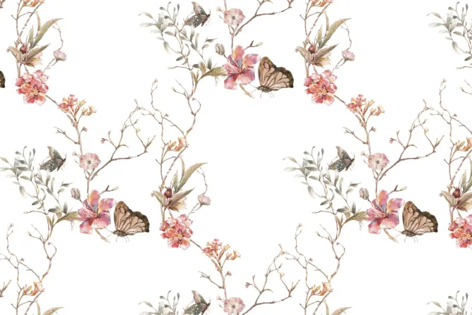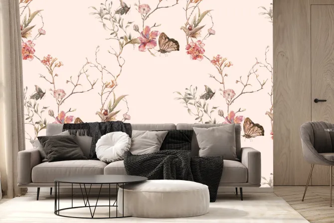 Fototapeta: Kwiaty i motyle na gałązkach w stylu akwareli delikatna ilustracja