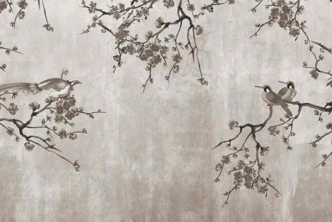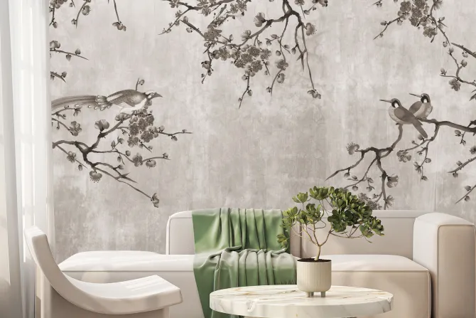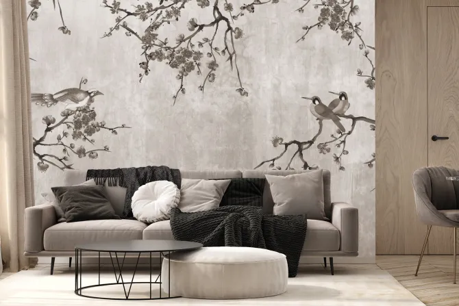 Fototapeta: Kwiaty wiśni z ptakami na betonie w szarości