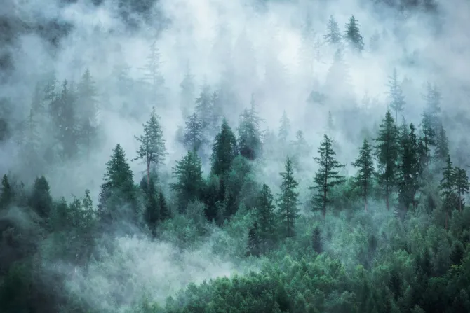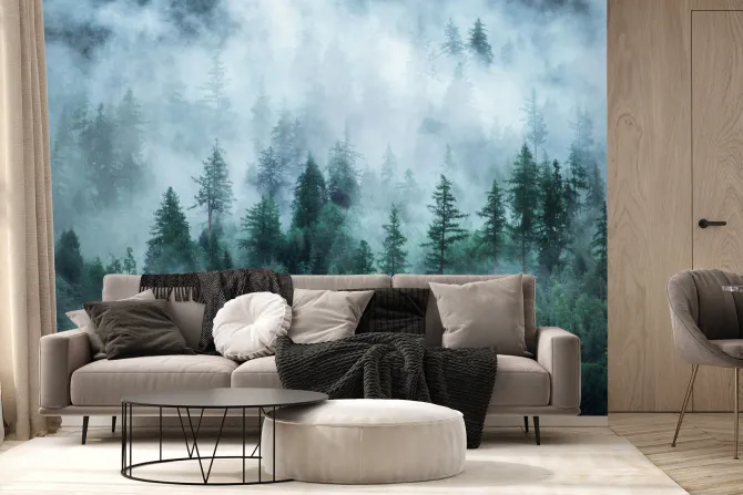Fototapeta: Las iglasty we mgle w chłodnych odcieniach