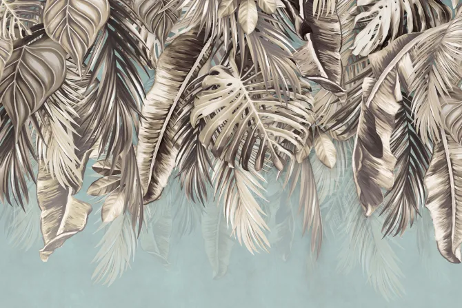 Liście palm i monstery na niebieskim tle.