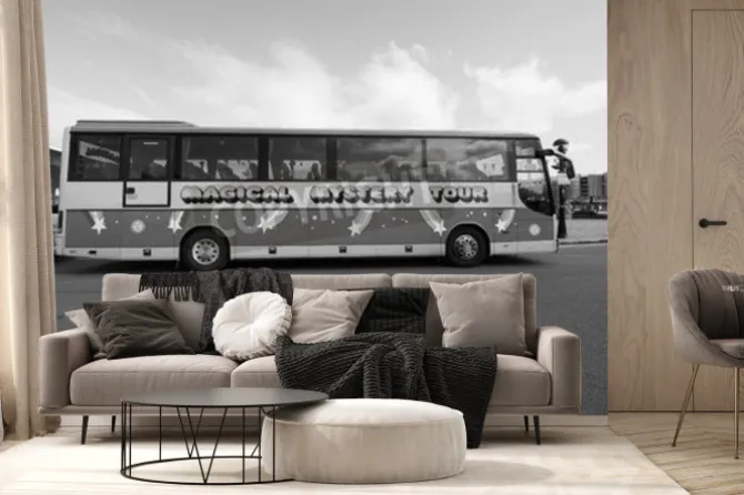 Liverpool, Wielka Brytania – OKOŁO czerwca 2016: The Beatles Magical Mystery Tour autobus w czerni i bieli.