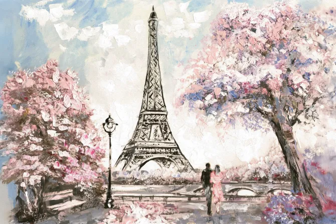 Malowany krajobraz Paryża z kwiatami wiśni.
