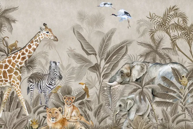 Malownicza dżungla z uroczymi zwierzątkami i roślinami.