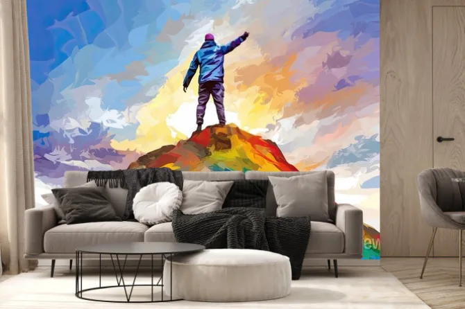 Man with backpack standing on the top of mountain and enjoying the view. Travel concept. Achieving your dreams. Illustration for cover, card, postcard, interior design, decor or print..