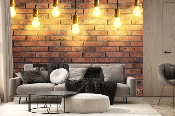 Fototapeta: Many pendant lamps against red brick wall