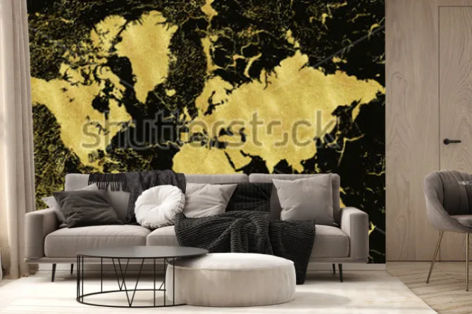 Fototapeta: Mapa świata ze złotawymi kontynentami na czarnym tle