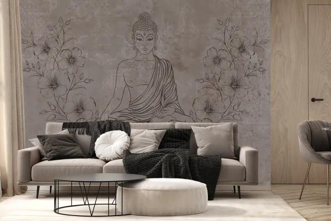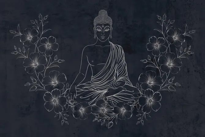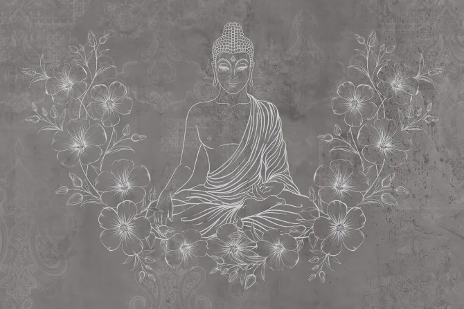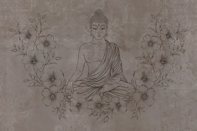 Medytujący Budda wśród kwiatów na teksturowym tle.