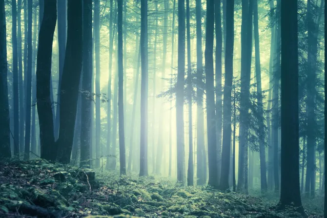 bajki, krajobrazy, mgła, drzewo, wiosna, las, zieleń, drewno