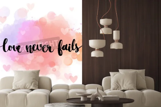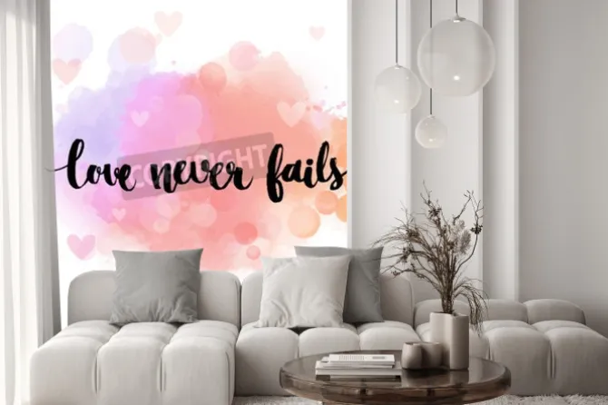 Fototapeta: Miłość nigdy nie zawodzi. czarny inspirujący cytat na pastelowym