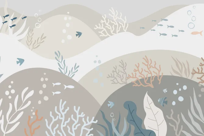 Minimalistyczny wzór z rybami w pastelowym podwodnym świecie.