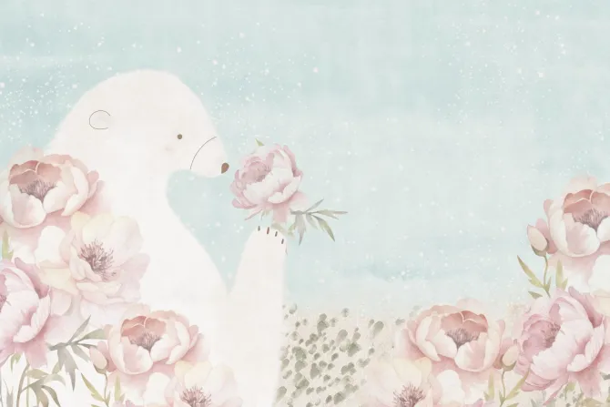 Miś i różowe kwiaty na błękitnym tle w stylu akwareli.