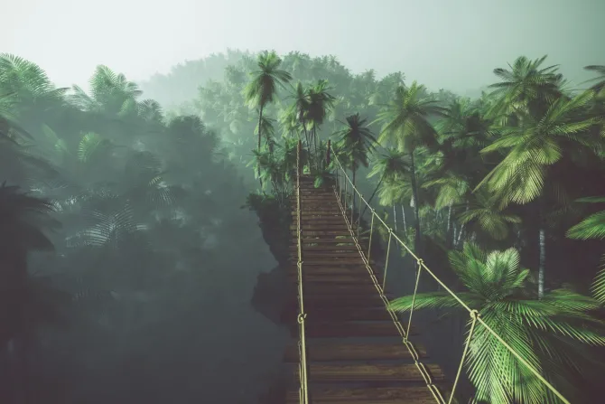 Fototapeta: Most linowy w mglistej dżungli z palmami