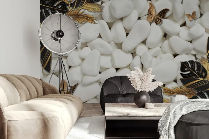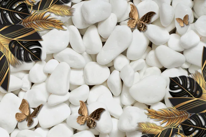 Motyle i egzotyczne liście 3D na tle białych kamieni.