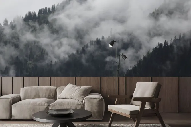 Fototapeta: Mroczne mgły nad alpejskim górskim lasem