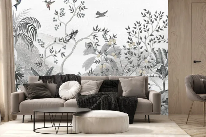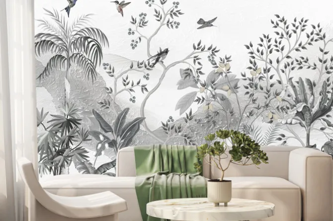 Mural z palmami ptakami i z owocami na drzewach.
