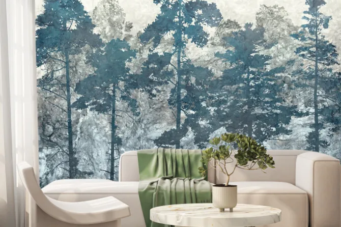Mural z sosnowym lasem.