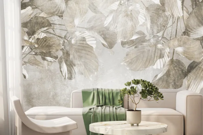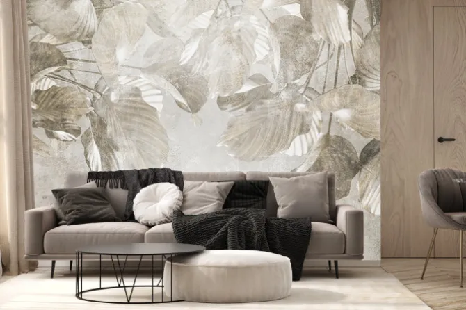 Mural z wiszącymi liśćmi tropikalnymi na szarej teksturze.