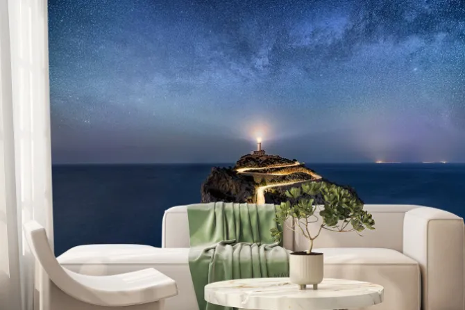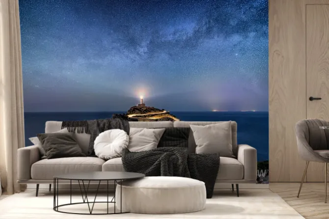 Night time image with milky way stars and illuminated road with light trails at the Far de Formentor lighthouse on Mallorca, Spain.