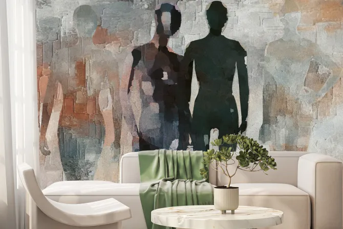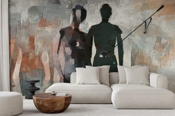 Nowoczesny wzór z abstrakcyjnymi sylwetkami ludzkimi na artystycznym tle.