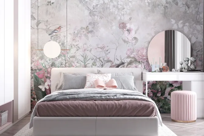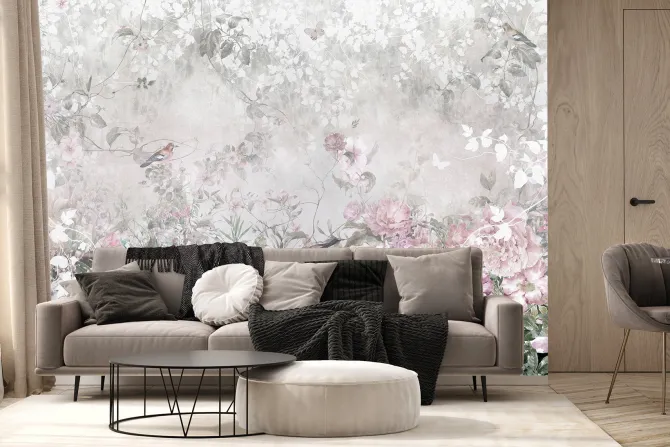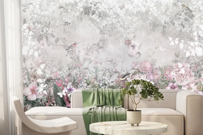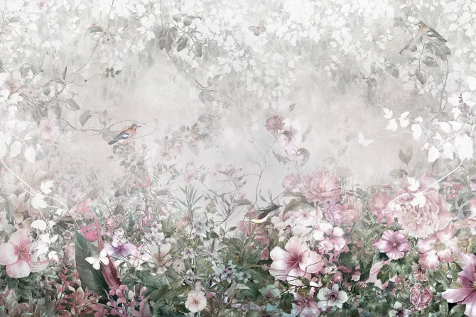 Pastelowe kwiaty ptaki i motyle.