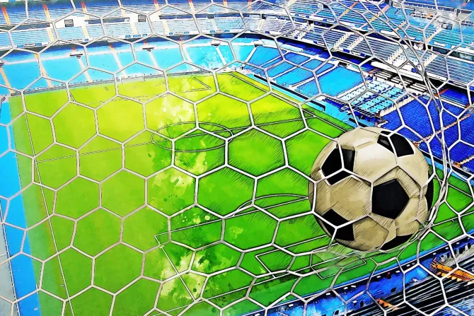 Piłka nożna w siatce na tle boiska.
