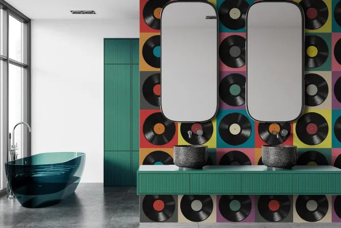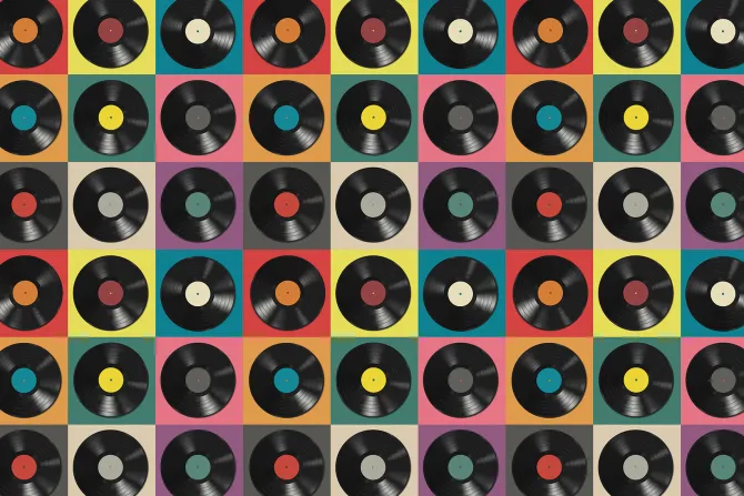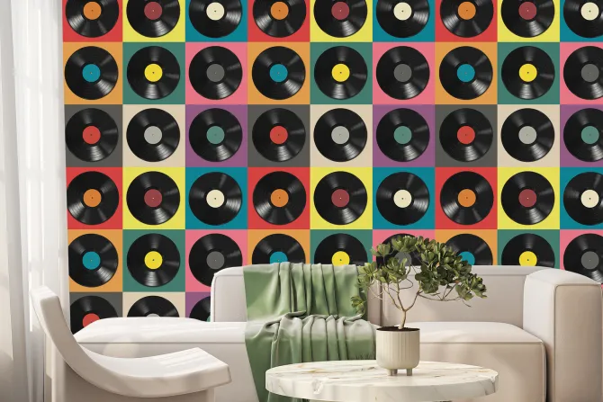 Płyty winylowe na kolorowych kafelkach.