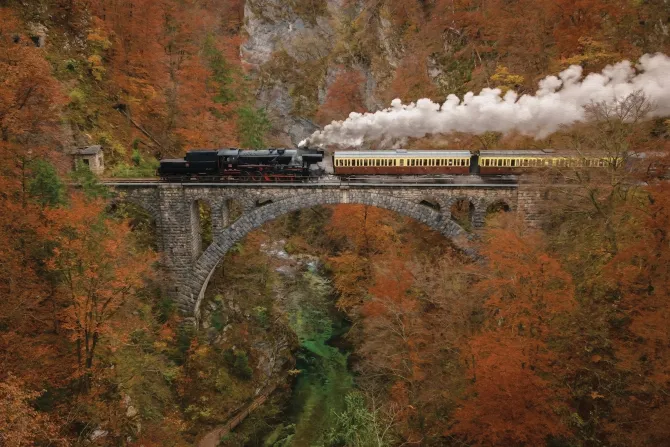 Fototapeta: Pociąg na moście w jesiennym lesie