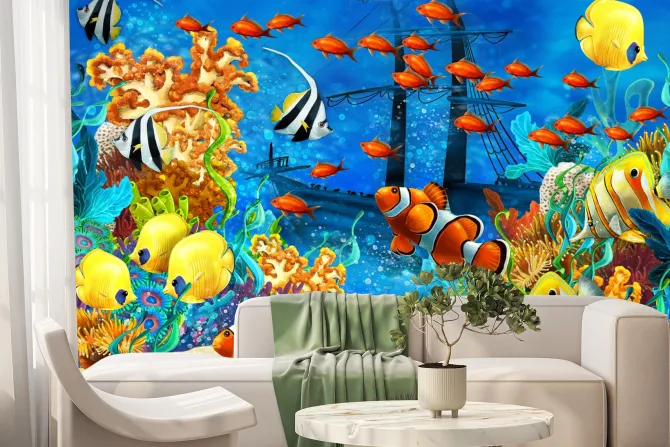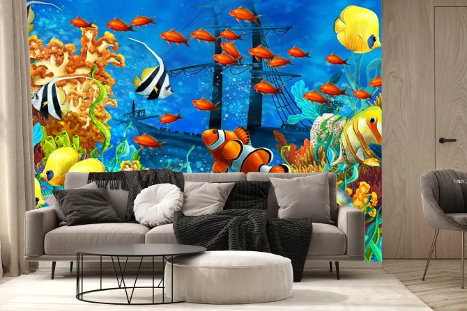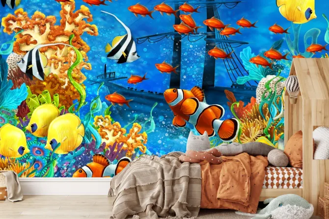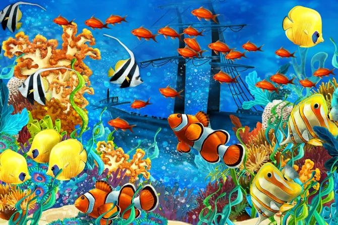 Podwodny krajobraz z rybami statkiem i rafą koralową w żywych kolorach.